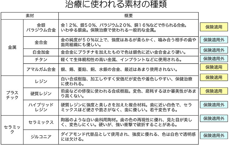 治療には保険治療と自由(自費)治療があり、使用できる材料や治療内容に違いがあります。
